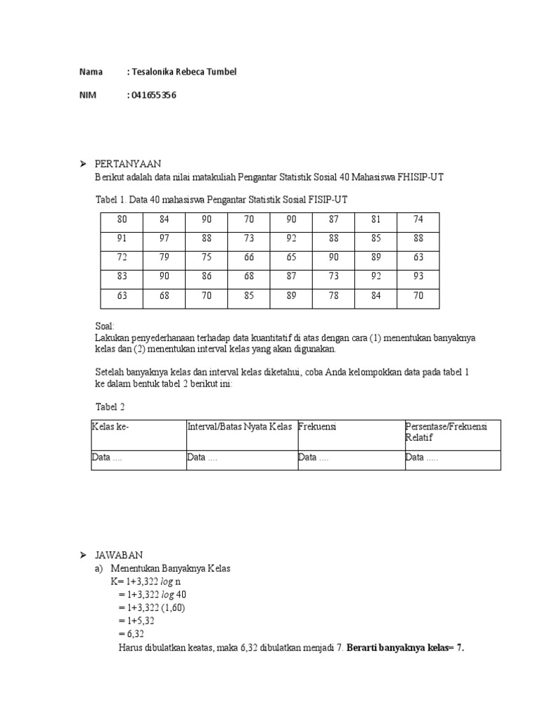 Materi inisiasi kali ini tentang ukuran pemusatan dan ukuran penyebaran atau materi modul 3 dalam bmp isip4215. Girinda puri setelah banyaknya kelas dan interval kelas diketahui coba anda kelompokkan data pada tabelpengantar statistik sosial isip4215 upbjj ut kota batam tugas 1 berikut adalah data nilai matakuliah pengantar statistik sosial 40 mahasiswa. Soal ujian pengantar statistik sosial ut semester 2. Selamat membaca :) pengertian statistika ahli statistik h.g. Keefektifan model team assisted individualization terhadap hasil belajar matematika siswa kelas v sd gugus kresno kecamatan jati kudus. Buku jawaban tugas mata kuliah tugas 1 nama : Pengantar antropologi (1) pengantar bisnis (7) pengantar ekonomi makro.14 (8) pengantar ekonomi mikro.25 (1) pengantar ilmu administrasi negara (6) pengantar ilmu ekonomi (7) pengantar ilmu perpustakaan (1) pengantar ilmu politik (7) pengantar matematika kelas 02 dll (8) pengantar sosiologi (7) pengantar statistik sosial (6) pengelolah sumber. Tugas 3 pengantar statistik sosial. Buku materi pokok (bmp) isip4215 pengantar statistik sosial berisi pembahasan mengenai statistika dasar. Soal pengantar statistik sosial tugas mandiri pengantar statistik sosial (isip4215) petunjuk: Penyajian dalam setiap modul disertakan dengan contoh perhitungan untuk mempermudah mahasiswa dalam memahami materi yang ada. Tentang titoadidewanto2013 saya adalah guru matematika sma bbs bogor. 030090032 tugas ii pengantar statistik sosial tahun penduduk miskin